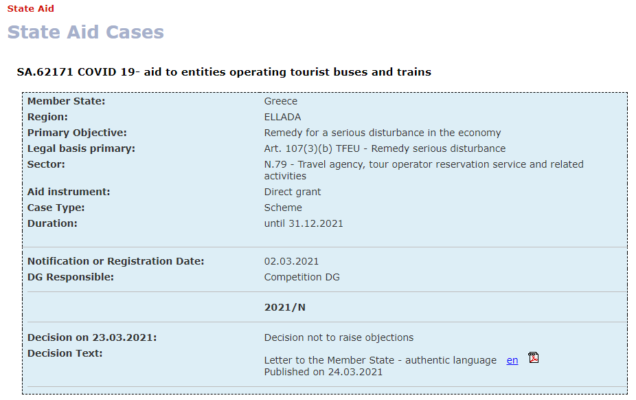 On 23 March 2021, the European Commission announced that it has decided to approve, under the Temporary Framework to support the economy in the context of the COVID-19 outbreak, a Greek scheme to support operators of tourist buses and trains.