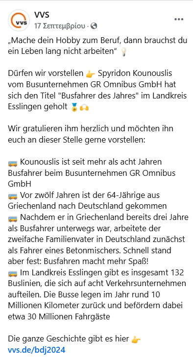 Αυτό το σημαντικό επίτευγμα για έναν Έλληνα οδηγό λεωφορείου στη Γερμανία δείχνει ξεκάθαρα όχι μόνο τις μεγάλες ικανότητες του ίδιου του Κουνουσλή, αλλά και τη δέσμευσή του να προσφέρει άριστες υπηρεσίες στους χιλιάδες επιβάτες του καθημερινά.